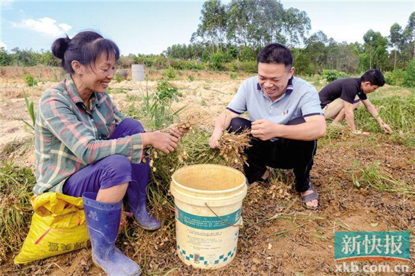 在洪排村的田頭,貧困戶謝翠雲正在收花生,她說,田裏花生的種子就是省農科院免費發放給她的,長熟後個頭更大,比當地的土花生一畝能多收兩三百斤。