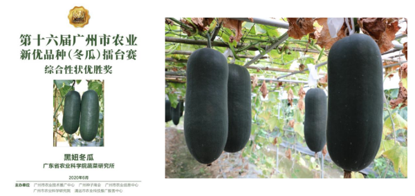 “黑妞”冬瓜,為出口專用型品種,生長勢中,中熟,皮色濃黑有光澤,冬瓜風味濃,耐貯運,適合密植。2020年獲得第十六屆廣州市農業新優品種冬瓜擂台賽綜合性狀優勝獎。目前已在廣東省博羅、番禺、英德等黑皮冬瓜主產區大麵積推廣,主要出口至溫哥華、新加坡等地。
