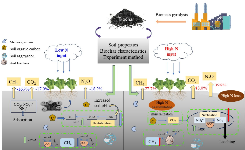 本研究分析了來自43篇同行評議文獻中的351組觀測數據,探討了蔬菜生產中生物炭特性、氮肥用量、土壤特性和溫室氣體排放之間複雜的相互作用,重點發現了蔬菜生產係統中氮肥用量對生物炭與溫室氣體排放效果有顯著影響。結果表明,在低氮投入量下(≤300 kg N ha-1),生物炭通過增強對CO2和N2O的吸附能力,表現出良好的減排效果,N2O、CO2和CH4排放量分別比對照降低了18.7%、17.9%和16.9%;然而,隨著施氮量的增加,生物炭作用逐漸演變,生物炭吸附能力飽和、土壤微生物活性變化等因素的相互作用,促進土壤中剩餘氮以氣體形式反向釋放,形成複雜而獨特的氣體排放逆轉機製,表現在高氮輸入條件下(>300 kg N ha-1),N2O、CO2和CH4排放量增加了39.7%、43.0%和27.7%。另外,土壤pH、SOC、生物炭C/N比、pH和熱解溫度是也是影響生物炭調控溫室氣體排放的關鍵因素。綜上,生物炭施用對蔬菜生產係統的溫室氣體排放表現出雙重作用,應用時需考慮氮肥用量及生物炭本身理化特性,從而實現蔬菜生產固碳減排最大化和可持續發展。