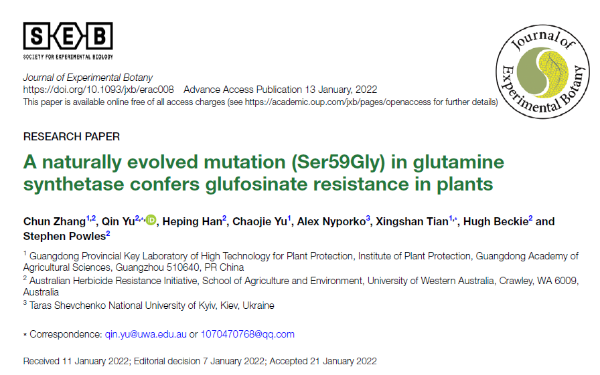 近日,植保所雜草防控研究團隊在雜草抗草銨膦分子機理研究方麵取得重要進展。研究論文A naturally evolved mutation (Ser-59-Gly) in glutamine synthetase confers glufosinate resistance in plants”於2022年1月21日,在國際知名植物學期刊Journal of Experimental Botany (IF 6.992)上公開發表。該研究首次報道了胞質型穀氨酰胺合成酶(EiGS1-1)發生Ser-59-Gly突變是牛筋草對草銨膦產生抗藥性的重要分子機理。必威betways 植保所張純博士為論文第一作者,植保所田興山研究員和西澳大學餘勤教授為共同通訊作者。