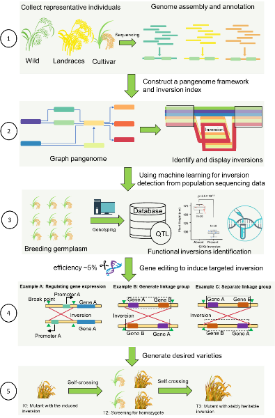 以泛基因組和機器學習方法為技術框架,利用基因編輯技術和發現倒位變異進行育種改良的流程概述