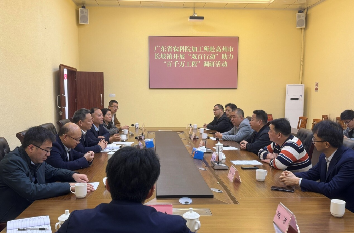 為貫徹落實省委關於實施“百縣千鎮萬村高質量發展工程”工作部署,落實院服務“雙百行動”工作安排,近日,加工所黨委書記姚文山、副所長吳繼軍率加工所高州技術服務團成員到高州市開展“雙百行動”科技對接。我院“雙百行動”駐高州服務隊副隊長兼高州市“百千萬工程”指揮辦副主任宮曉波、我院茂名分院駐點人員陪同調研。