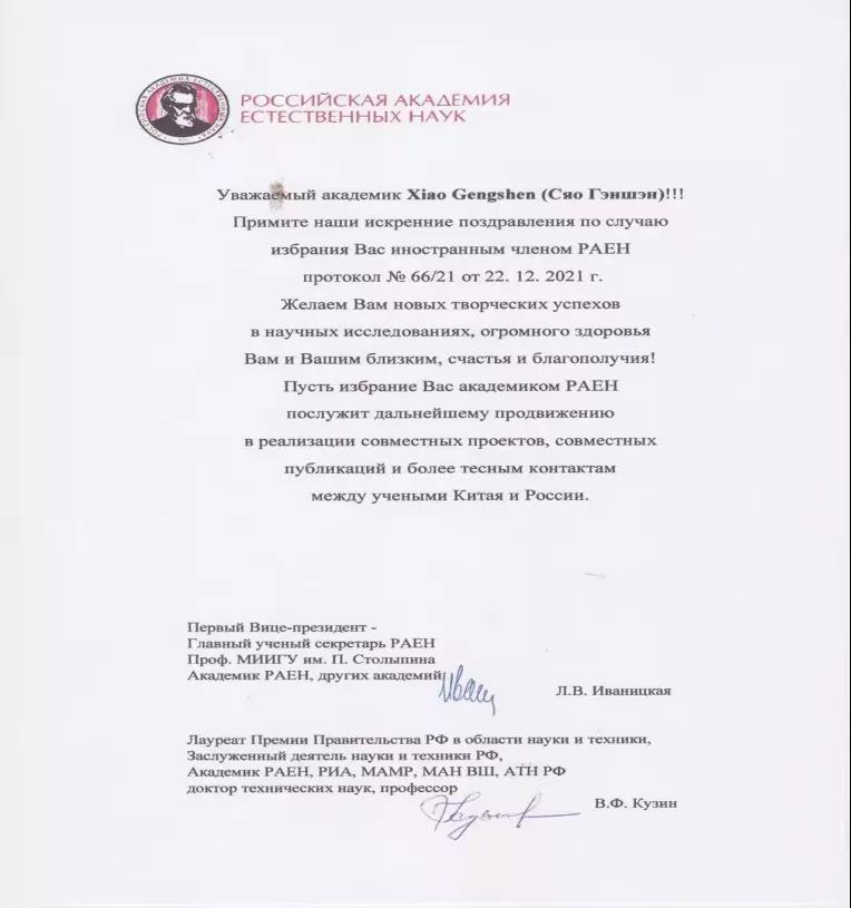 新年伊始,仲愷農業工程學院黨委常委、副校長肖更生研究員收到俄羅斯自然科學院發來的賀信,充分肯定肖更生研究員在農業科學領域所取得的卓越成績,並祝賀他當選為俄羅斯自然科學院外籍院士。這是繼去年十一月當選烏克蘭工程院外籍院士之後,肖更生研究員再度當選國外知名科學機構外籍院士。